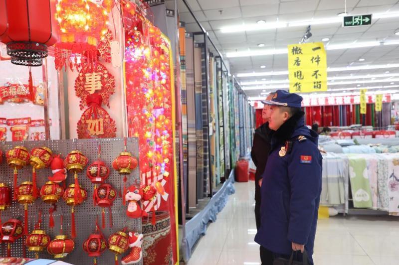 15日,北青报记者跟随防火监督员检查时看到,世纪园市场中个别商户进货量太大,占用了公共走道。在一家销售春联等节庆用品的店铺,店主将刚进的几箱货品堆放在疏散通道上,怀柔区消防救援支队监督二科副科长刘伟立即督促商家迅速将占用疏散通道上的货物挪移,保障疏散通道的畅通。